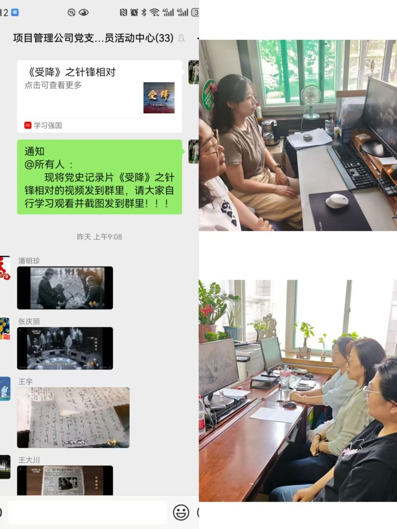 9月1日,項目管理公司黨支部開展“重溫歷史 奮勇爭先”主題活動。活動中,全體黨員干部共同觀看黨史紀錄片《受降》,紀錄片以詳實的史料、珍貴的影像生動展現(xiàn)中國共產(chǎn)黨始終以人民利益為根本,在復(fù)雜形勢下堅守信仰、運籌帷幄的政治智慧和使命擔當,引導黨員干部不斷加強黨史學習,切實把優(yōu)秀歷史經(jīng)驗轉(zhuǎn)化為推動工作的實際行動。